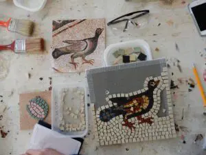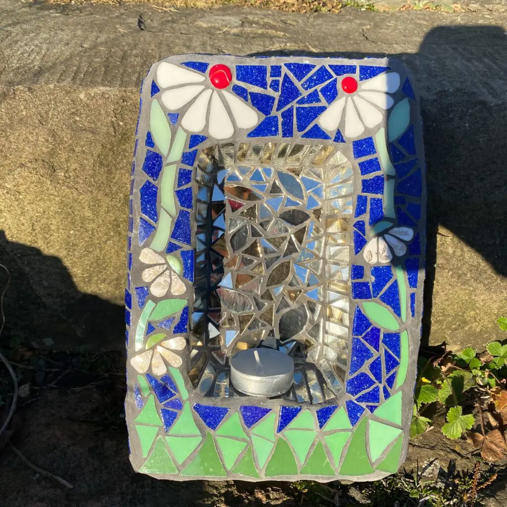 - create their main mosaic from glass tiles and discarded ceramics, creating the design, choosing the correct materials for each project and how to make defined shapes from your tile pieces. This could be a house sign, a steppingstone, bird table or small shrine.