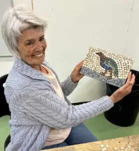 Helen Miles is a highly skilled mosaic artist and teacher, known for her beautifully crafted contemporary mosaics inspired by ancient techniques. Her fascination with mosaic making began during her time in Thessaloniki, Greece, where she trained under master craftsmen in Byzantine methods, working extensively with stone and marble .