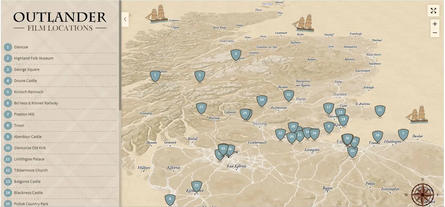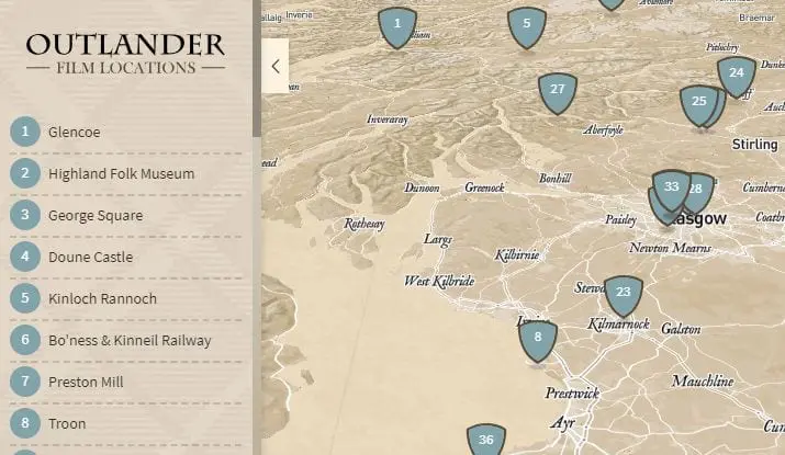 The interactive map features an incredible 36 Scottish Outlander film locations! You can even download a FREE OUTLANDER FILM LOCATIONS MAP from Visit Scotland’s website.